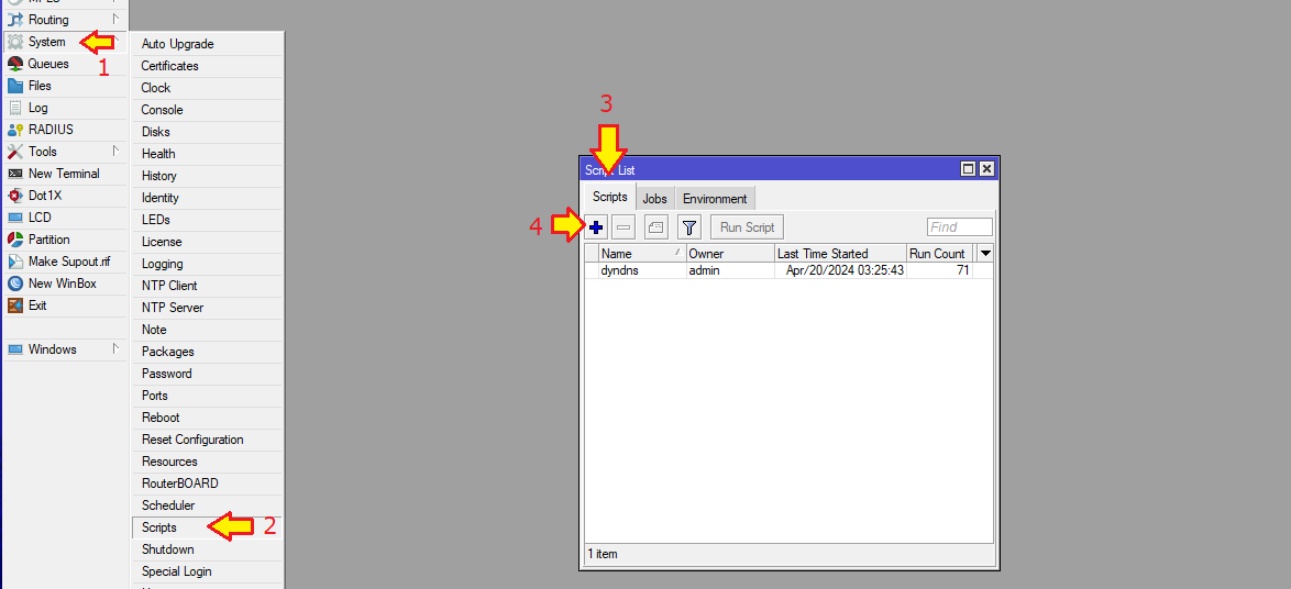 Um das Script auf RouterOS anzulegen, loggen wir uns mit der Winbox auf dem Router ein und wählen im linken Menü den Prunkt System -> Scripts aus, worauf sich die Script List öffnet.