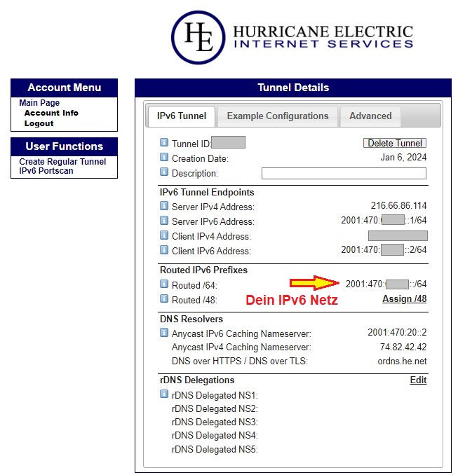 Nun gelangt Ihr direkt auf die Übersichtsseite Eure 6in4 Tunnels: