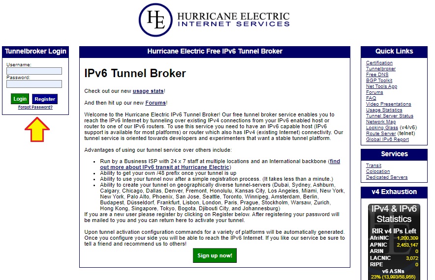 Als erstes müssen wir uns auf https://tunnelbroker.net einloggen.